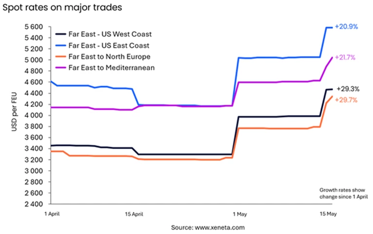“If carriers are able to make money from shippers who want to use the spot market to frontload additional volumes ahead of peak season, then clearly they are going to take that opportunity and that is what we have seen in the rate increases in May.