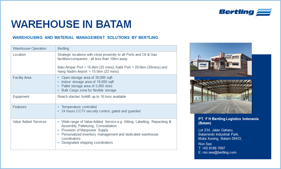 We are excited about this new chapter for Bertling Logistics in Batam, where we are expanding our presence through the support and management from Bertling Singapore. Batam is an important consolidation hub and transit point for our existing businesses in Singapore, Indonesia, Malaysia and Australia.