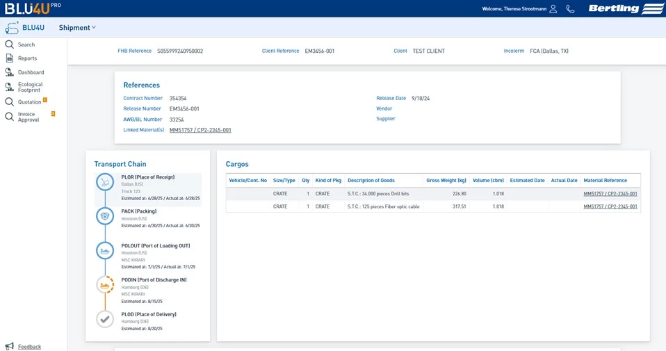 With our Tracking Feature, simply log in to BLU4U, enter your reference on the search screen, and instantly get an overview of your shipments. Whether you are managing deliveries or aligning production schedules, you will always have the latest information at your fingertips.