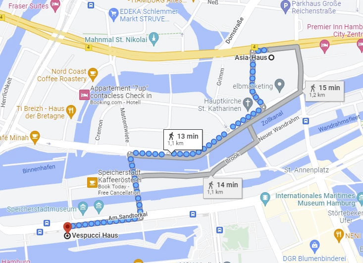 The Vespucci House was built in 1993 and is located vis-à-vis the Elbphilharmonie, Hamburg’s famous opera house. It is also nearby Hamburg’s famous Speicherstadt (a traditional merchants’ area of Hamburg) and close to the city center. It is also located along the traditional harbor of Hamburg Hafencity. The new premises have parking spots available and e-car charging stations alongside the road.