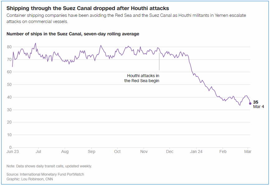 Following the recent fatal attack on the M/V True Confidence causing deaths, we expect shipping lines to review their remaining schedules/passages through the Suez Canal (e.g. CMA, MSC).