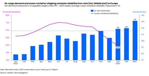 Shippers continue to turn to air cargo due to unreliability in ocean freight services. The market is once again experiencing a shift in transport mode, this time around the disruption has been caused by ongoing conflict in the Red Sea. However, the impact of the Red Sea incident and uptake on air freight remains limited. Customers are increasingly looking at multimodal transport solutions such as sea-air logistics. Capacity constraints may become an issue for this solution.