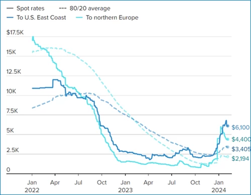 Moving from USD 400 per FEU by the end of 2023 to more than USD 1,000 per FEU by mid-February, market average spot freight rates have gone up by 150% in six weeks. Within these market average spot rates, some shippers have been paying upwards of USD 1,000 in additional costs while others have managed to avoid surcharges altogether, with an average of USD 591 per FEU.
