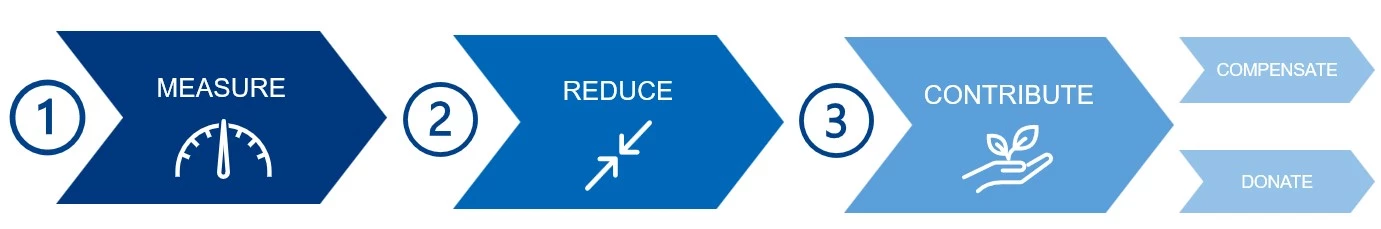 With our Sustainability Solution, our customers can transport their goods around the world in a responsible manner by (1) measuring, (2) reducing and (3) contributing through compensation or donation for their emissions. Step 3 has been renamed from 'Compensation' to 'Contribution' as it offers two ways to contribute: