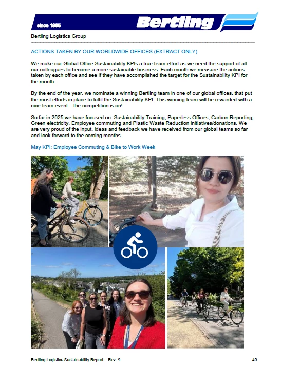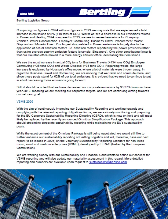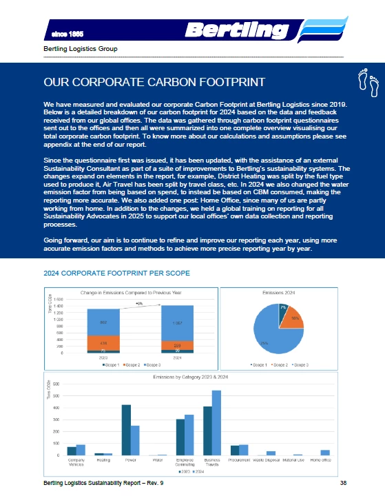 We are pleased to announce that we have added our 2024 carbon footprint data to our Sustainability Report for Bertling Logistics. From page 37 onwards you can now read about our global Scope 1, 2 and 3 emissions from 2024 in the various emission categories and the related explanations.